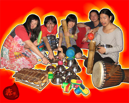 民族パーカッションと、シンプルな歌で構成される、赤チン先生率いる謎の打楽器集団。